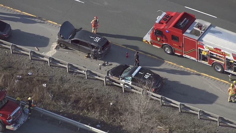 Police vehicles damaged 401 Cobourg fatal crash APril 27 Damaged police vehicles are seen near the scene of a fatal motorcycle crash in Cobourg on April 27. (Chopper)