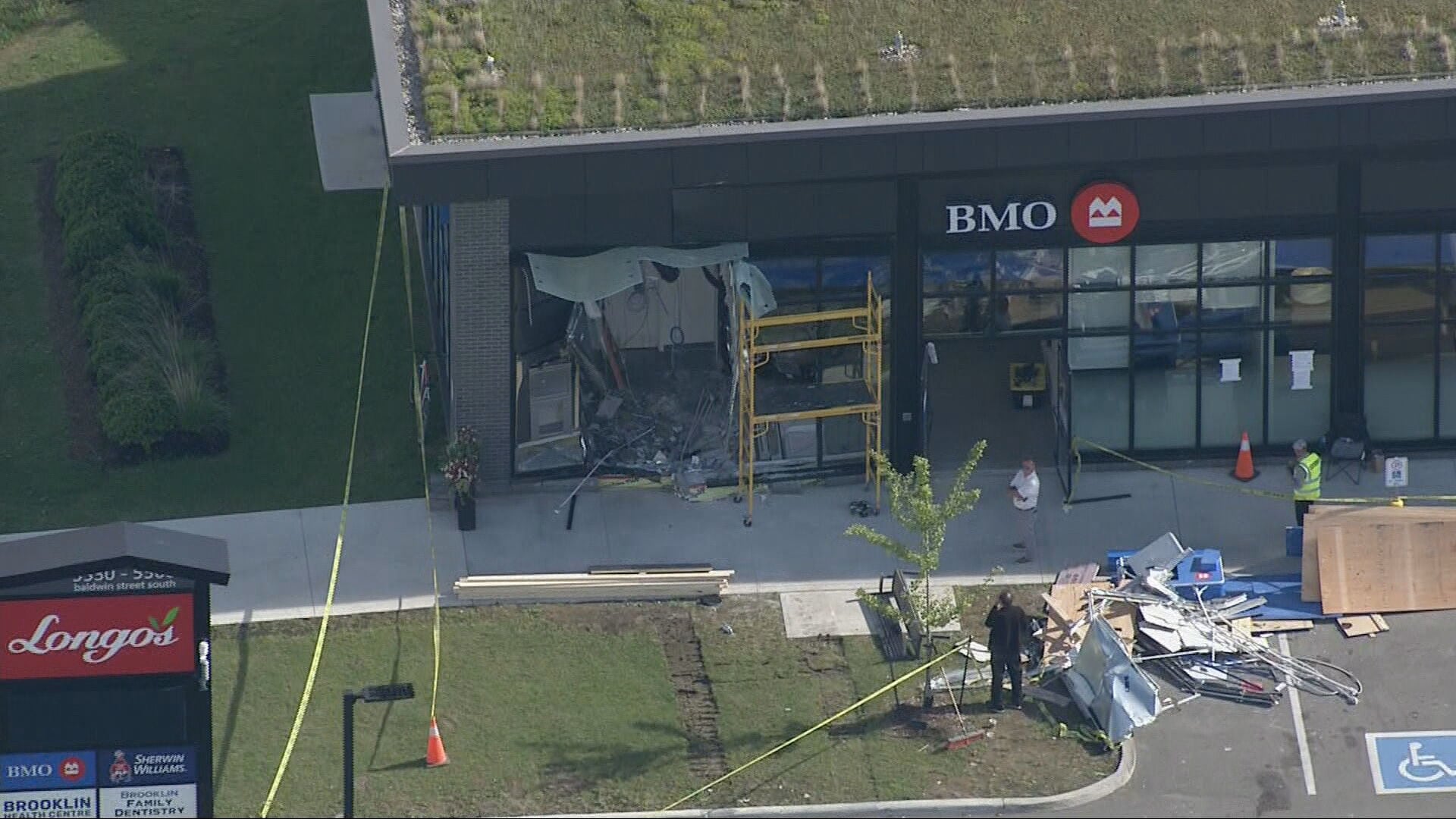 Police in Durham Region are searching for an unknown number of suspects who allegedly smashed the front entrance of a bank in Whitby with an excavator and removed an ATM early Tuesday morning.