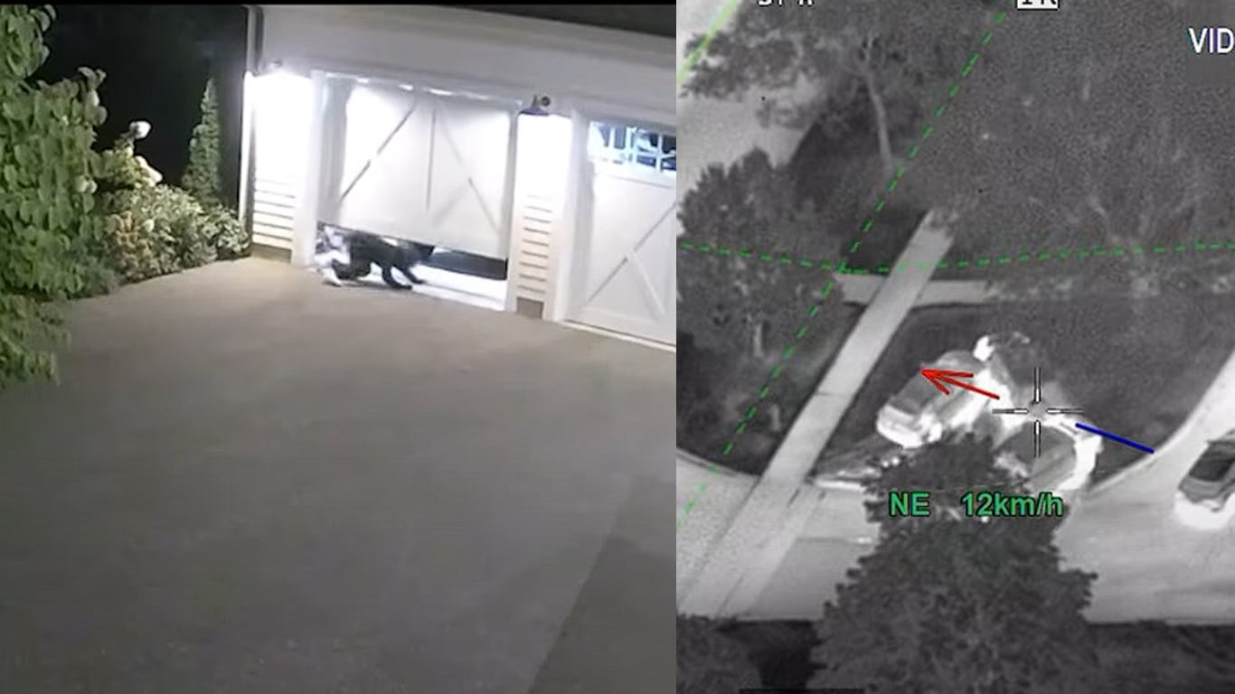 In the video, a suspect is seen running up the driveway of the home and rolling under a closing garage door as a Jeep G-Wagon is parking inside.