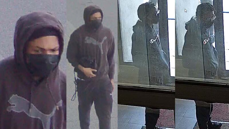 The first suspect is described by police as a male, who was last seen wearing a black surgical mask, a dark hooded sweatshirt with a Puma emblem on the front, black Puma brand jogging pants, and black Air Force One running shoes.