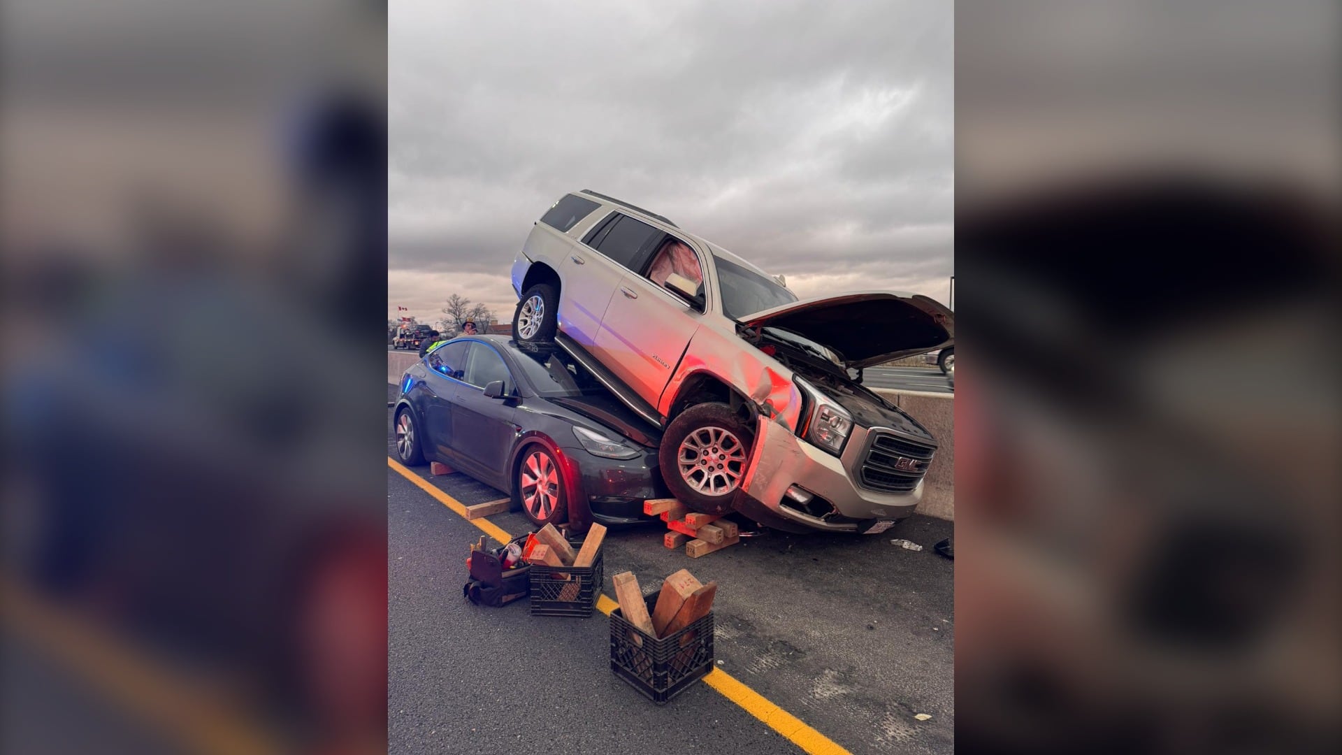 A SUV ended up on top of a Tesla SUV following a collision on the westbound Queen Elizabeth Way in Burlington late Monday afternoon.