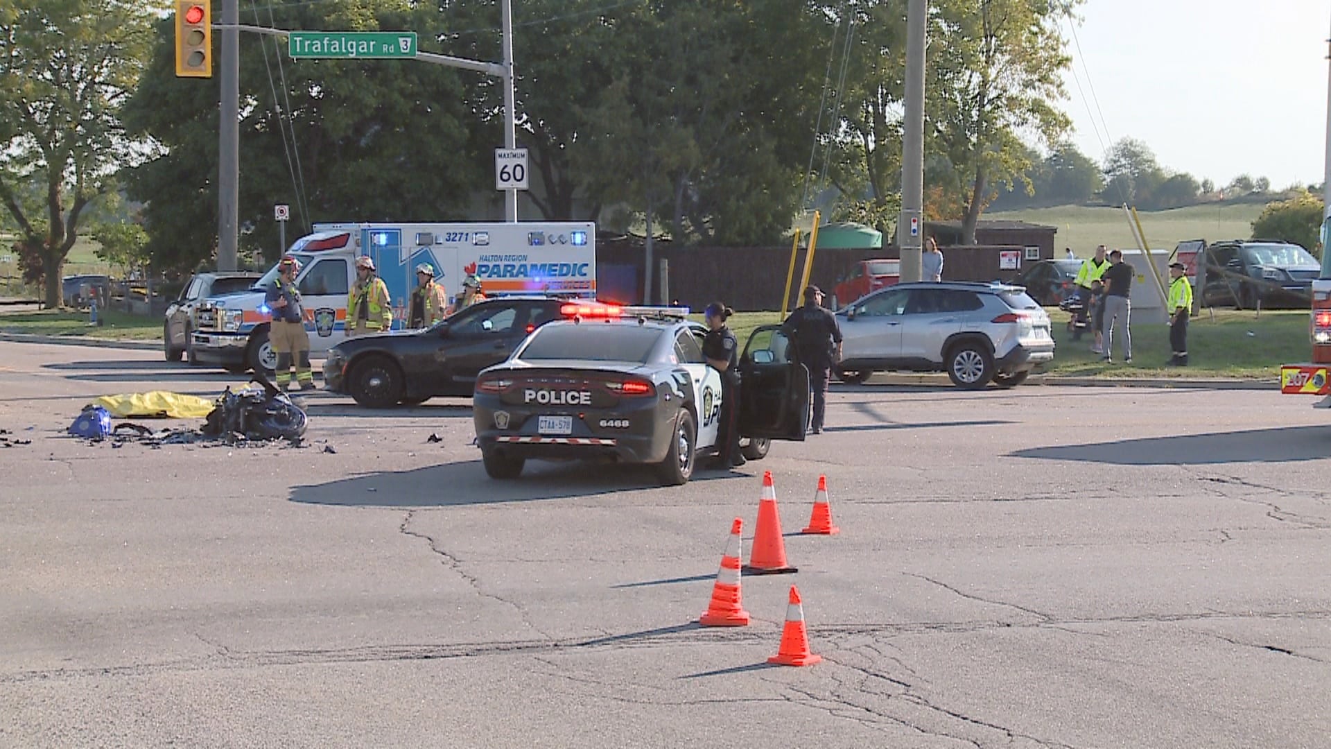 Police say the driver of a blue Yamaha motorcycle was travelling northbound on Trafalgar through the intersection when they collided with a black Acura RDX that was making a left turn from Trafalgar onto Burhamthorpe.
