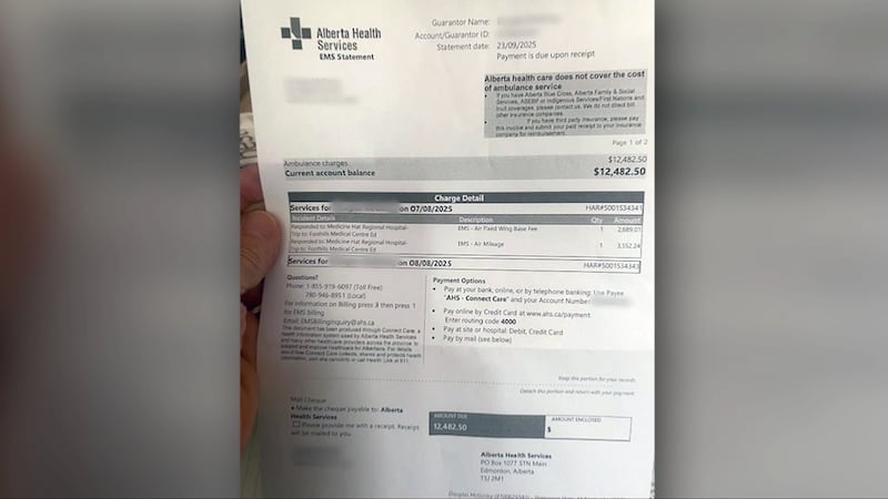 He said he was given excellent care but was surprised last month to get a bill from Alberta Health Services for ambulance charges of $12,483.