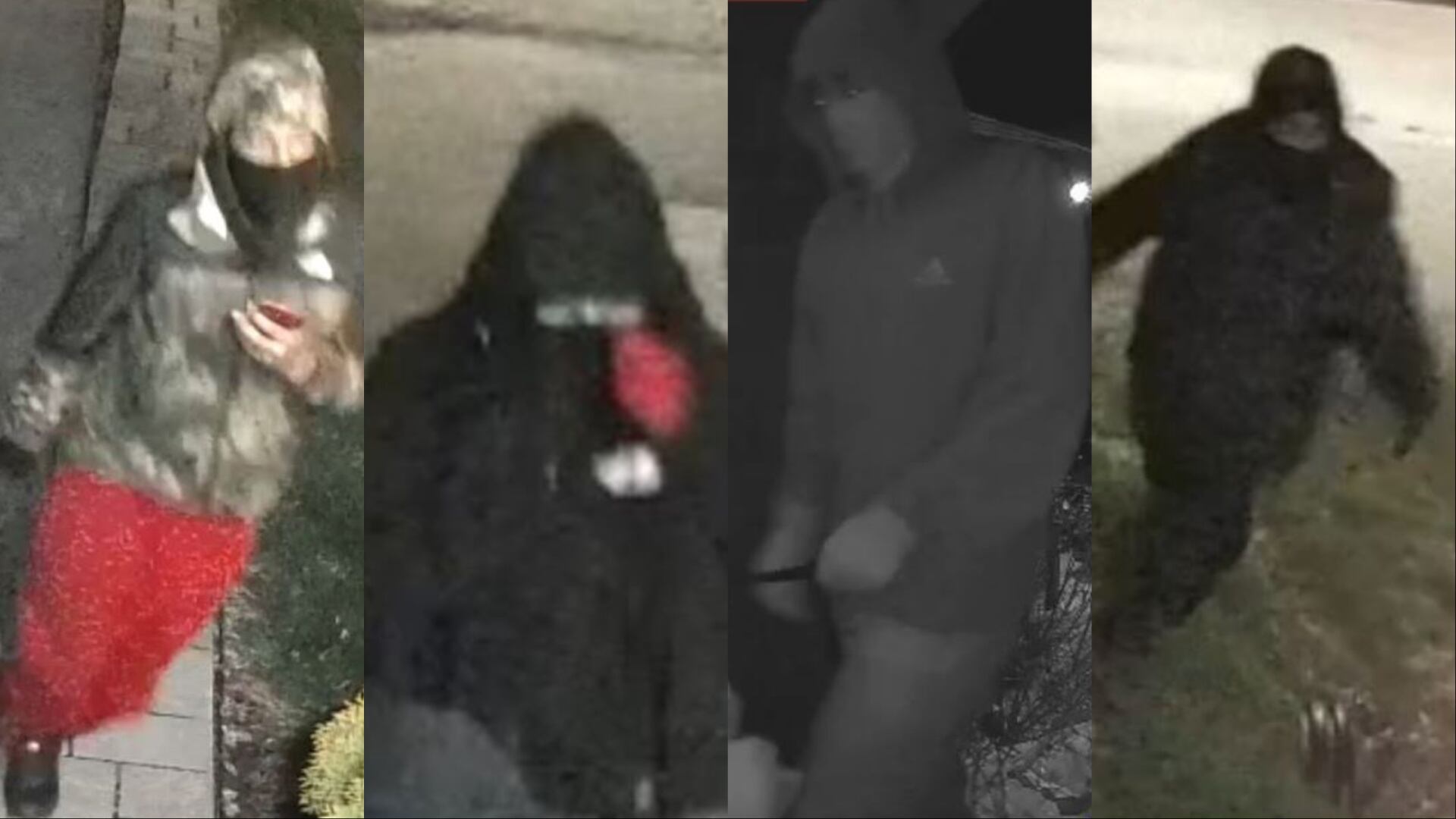 The fourth suspect is described as wearing a black hooded sweatshirt with a white logo on the chest, black face covering, white gloves and black pants.