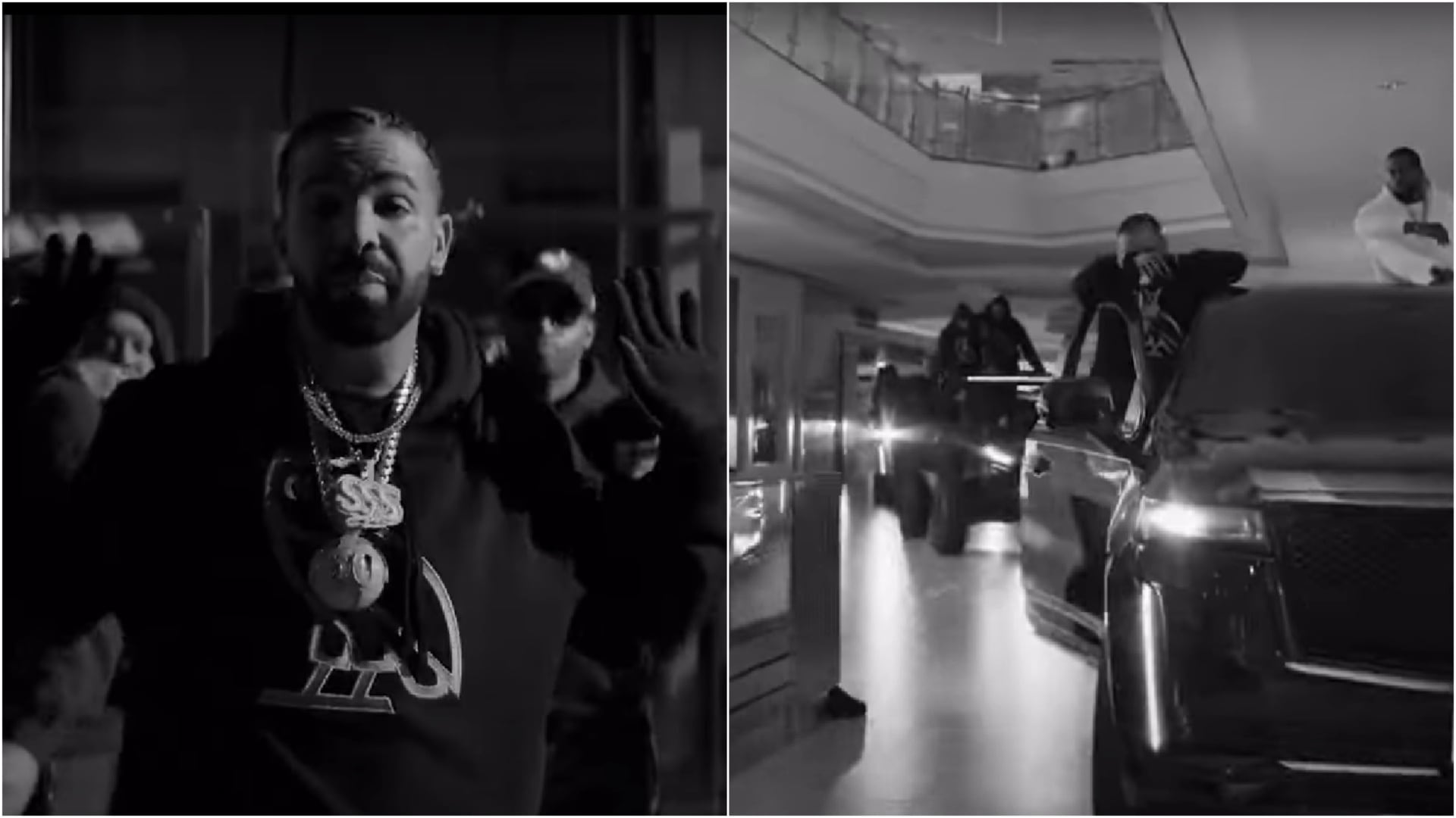 Drake can then be seen hanging out of the passenger’s seat of a Cadillac Escalade that’s driving through the mall, as members of his entourage follow behind on a variety of all-terrain vehicles.