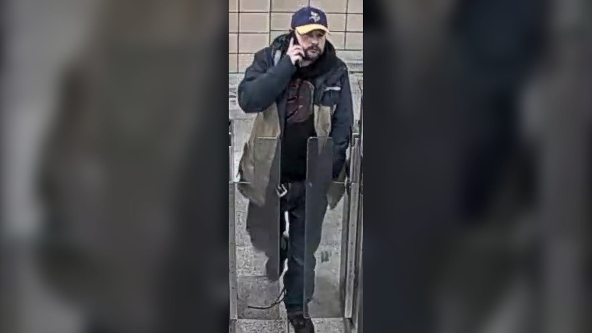 He is described five-foot-six with a medium to heavy build, and brown facial hair. The suspect was last seen wearing a green-beige jacket, black jeans, black running shoes, a black hooded sweatshirt with a “Toronto Raptors” logo, and a purple baseball hat with a yellow brim and a “Minnesota Vikings” logo on the front.