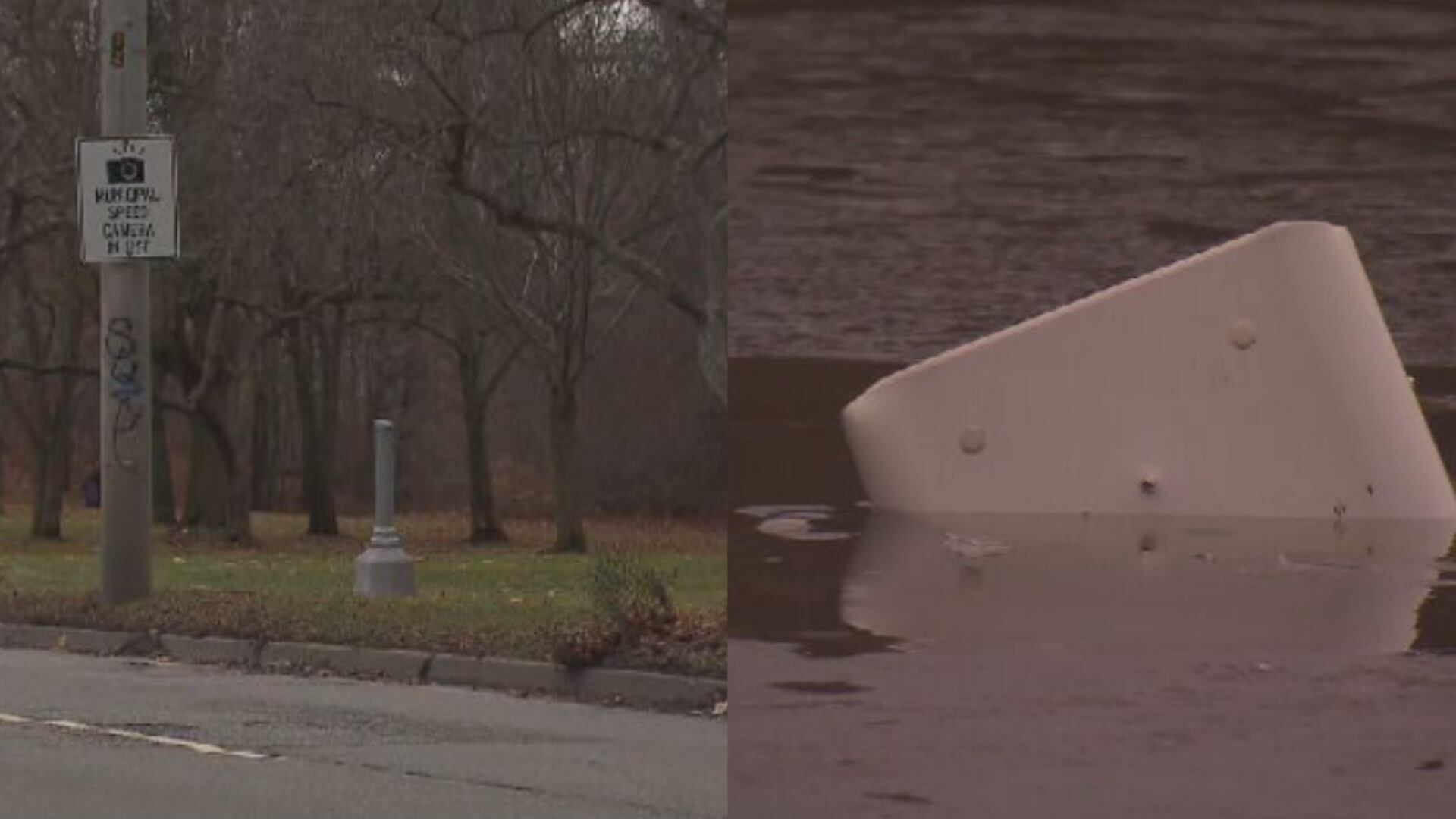Advocacy group Safe Parkside says the Automated Speed Enforcement (ASE) camera near Parkside Drive and Algonquin Avenue was recently cut from its post, dragged into nearby High Park, and dropped into a frozen-over body of water.