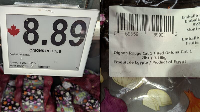 Another photo he provided shows a bag of red onions that is labelled as a product of Canada. However, another closer look at the packaging shows it is a product of Egypt.