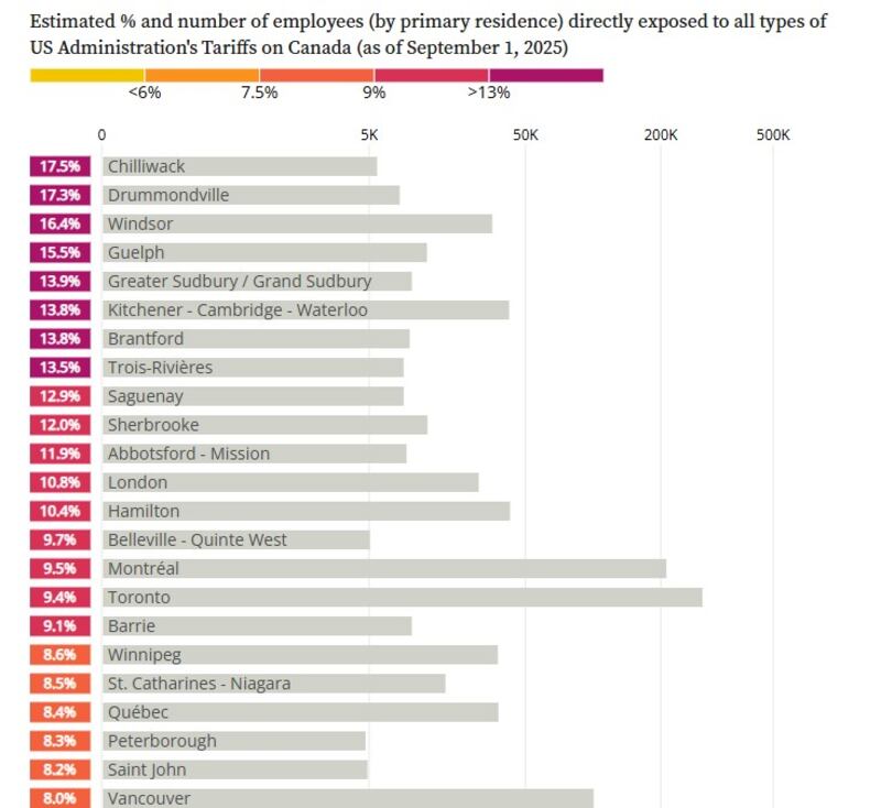 According to the tool, three out of five of the local areas where employees most likely to be impacted by all tariffs reside are in Ontario – Windsor (16.4 per cent of workers who call the city home); Guelph (15.5 per cent); and Greater Sudbury (13.9 per cent).