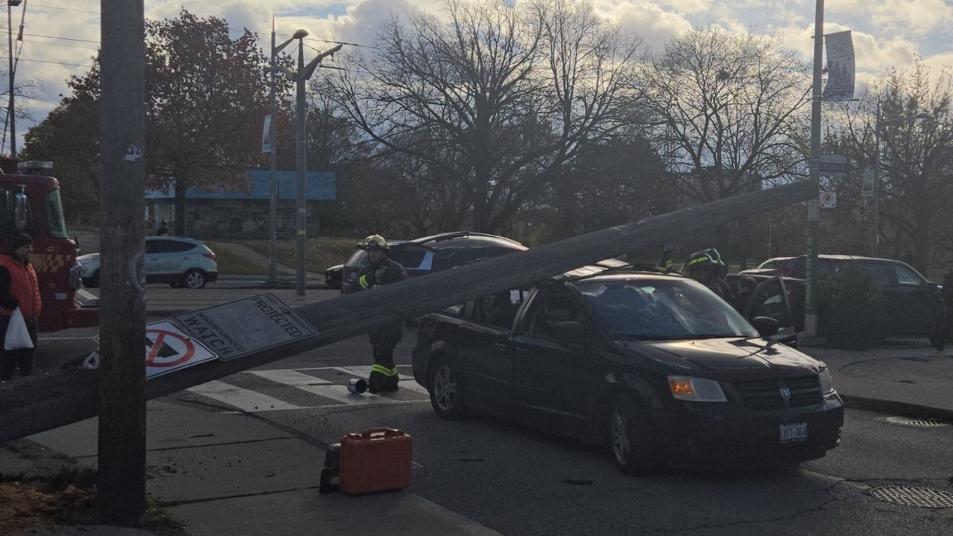 Toronto police said they were called to that area at 1:22 p.m. for reports of a hydro pole that had fallen onto a car.