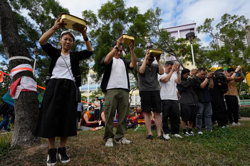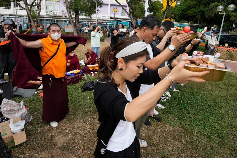 People make offerings during a Tibetan religious ceremony near the site of a deadly fire at Wang Fuk Court, a residential estate in the Tai Po district of Hong Kong's New Territories on Tuesday, Dec. 2, 2025. (AP Photo/Ng Han Guan)