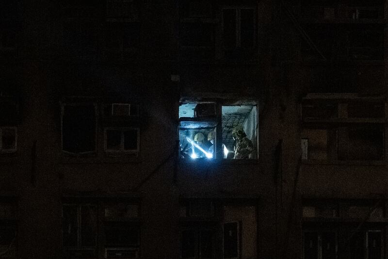 Firefighters with flashlights search a flat in a burned building after the deadly fire that started Wednesday at Wang Fuk Court, a residential estate in the Tai Po district of Hong Kong's New Territories, Saturday Nov. 29, 2025. (AP Photo/Chan Long Hei)