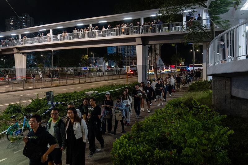 People stand in line to offer flowers for the victims near the site of Wednesday's fire at Wang Fuk Court, a residential estate in the Tai Po district of Hong Kong's New Territories on Sunday, Nov. 30, 2025. (AP Photo/Chan Long Hei)