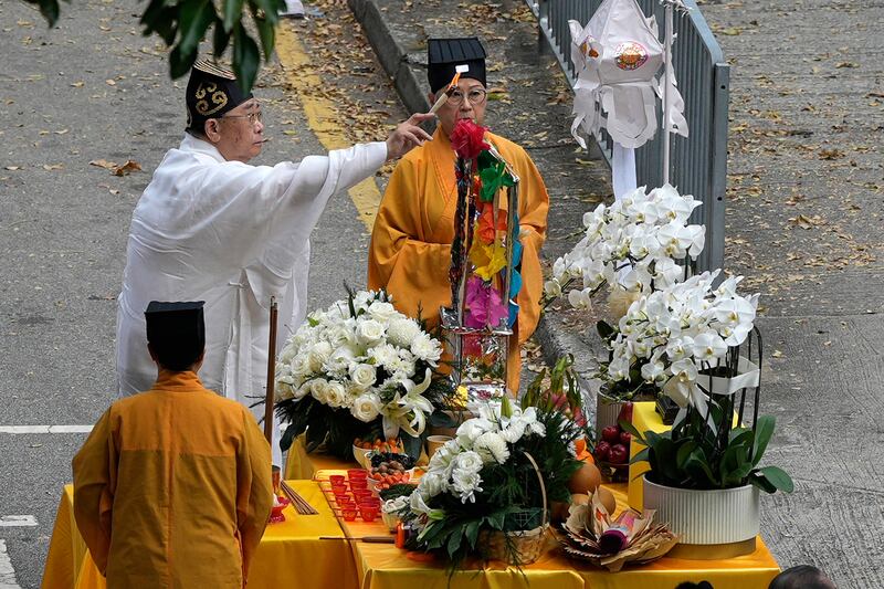 A Taoist priest prepares for a religious ceremony at the site of a deadly fire at Wang Fuk Court, a residential estate in the Tai Po district of Hong Kong's New Territories on Tuesday, Dec. 2, 2025. (AP Photo/Ng Han Guan)