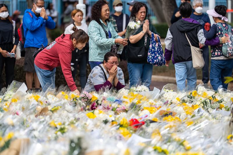 People offer flowers for the victims near the site of a deadly Wednesday fire at Wang Fuk Court, a residential estate in the Tai Po district of Hong Kong's New Territories on Monday, Dec 1, 2025. (AP Photo/Chan Long Hei)