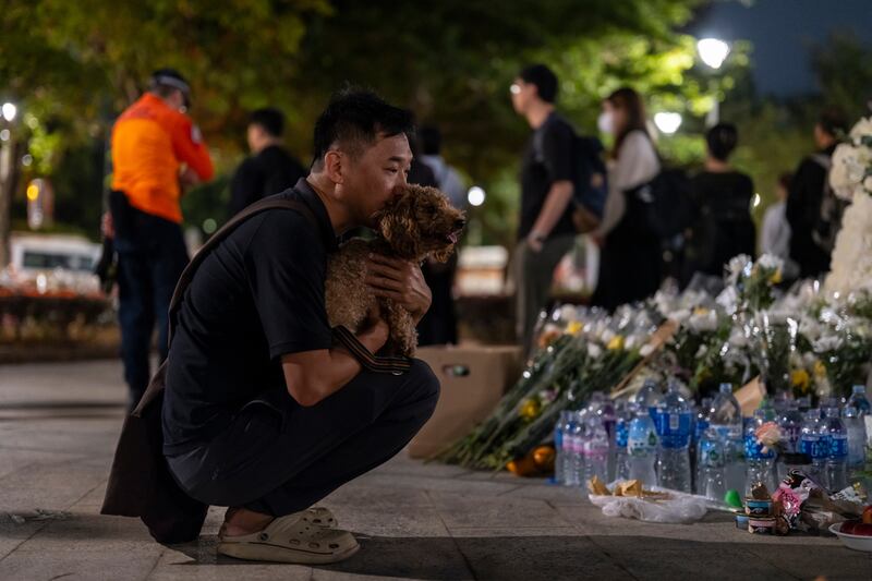 A man with his dog looks at the flowers for the victims near the site of a deadly fire at Wang Fuk Court, a residential estate in the Tai Po district of Hong Kong's New Territories on Tuesday, Dec 2, 2025. (AP Photo/Chan Long Hei)