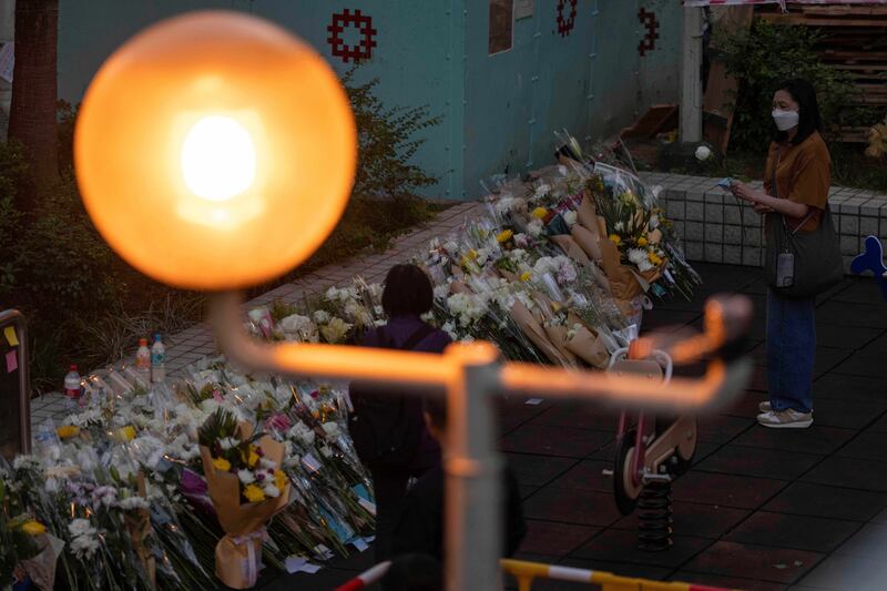People offer flowers for the victims near the site of Wednesday's fire at Wang Fuk Court, a residential estate, in the Tai Po district of Hong Kong's New Territories on Sunday, Nov. 30, 2025. (AP Photo/Chan Long Hei)