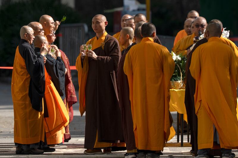 Tibetan monks lead prayers near the site of a deadly fire at Wang Fuk Court, a residential estate in the Tai Po district of Hong Kong's New Territories on Tuesday, Dec. 2, 2025. (AP Photo/Ng Han Guan)
