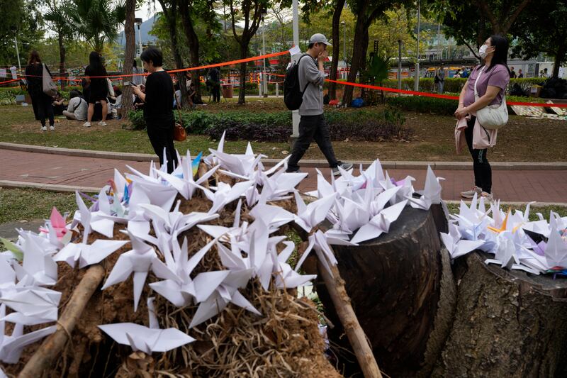 People pass near paper cranes placed near the site of a deadly fire at Wang Fuk Court, a residential estate in the Tai Po district of Hong Kong's New Territories on Tuesday, Dec. 2, 2025. (AP Photo/Ng Han Guan)