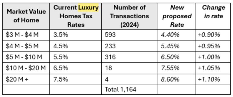Currently, luxury property purchasers in the city, those whose homes are valued at $3 million and more, pay what is known as the Luxury Homes Tax. The rates on these properties were established in 2023 and vary from 3.5 per cent for a residence that is valued between $3 and $4 million to 7.5 per cent for one that is $20 million and up.