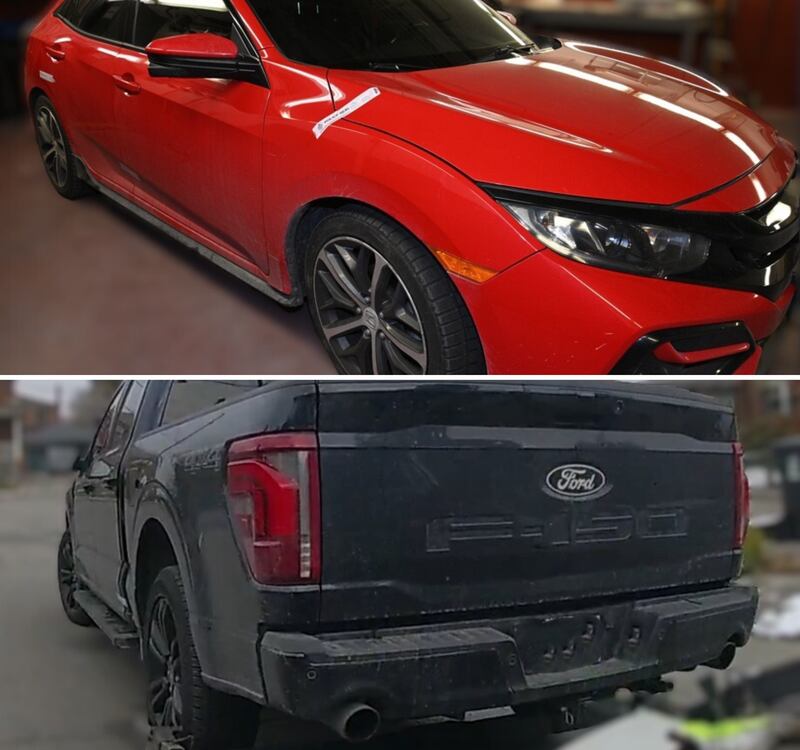 A short time later, the other stolen vehicle, a blue Ford F-150 belonging to the homeowner, was found and tracked to a dead-end street near Albion Road and Islington Avenue.