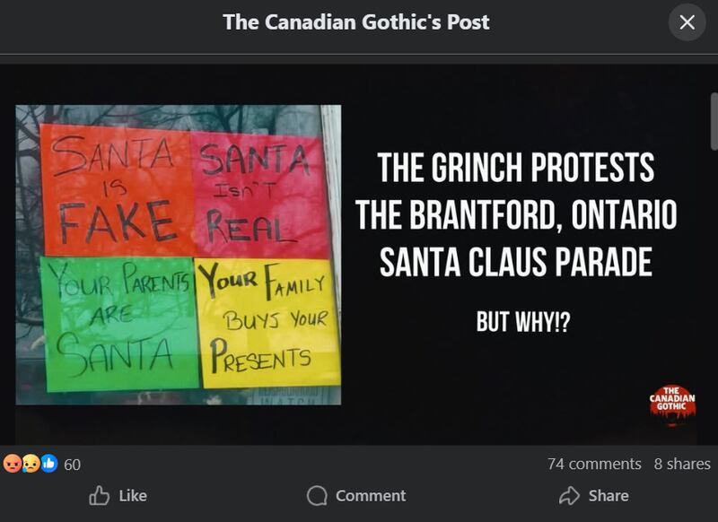 A previous version of this article used a headline where it stated police asked the homeowner to remove anti-Santa posters. Brantford Police did not ask for them to be removed, they spoke with the resident who then removed the signs. — As families gathered for a Santa Claus parade in a city west of Toronto, one resident’s signs hit like a snowball to the face, prompting a police visit in hopes they’ll dial down the Grinch energy.