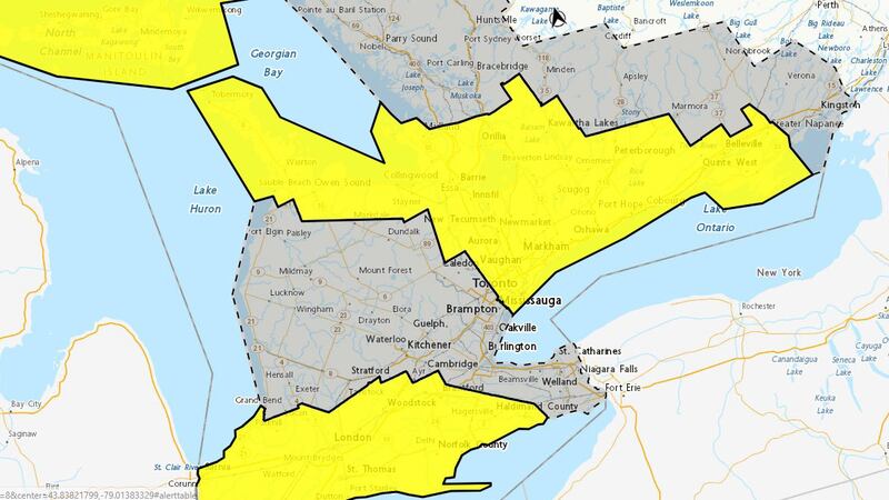 A yellow warning is currently in place for Toronto, York Region, Durham Region, Barrie, Peterborough, Belleville and parts of cottage country, as well as large swathes of southwestern and Northern Ontario.