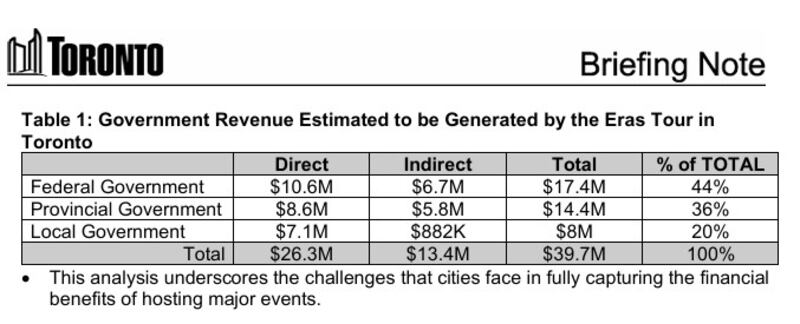 In a briefing note about the “Swiftonomics” that followed the November 2024 residency, Toronto’s general manager of economic development and culture laid out exactly how much the city spent on hosting the sold-out dates, as well as the money it recouped.