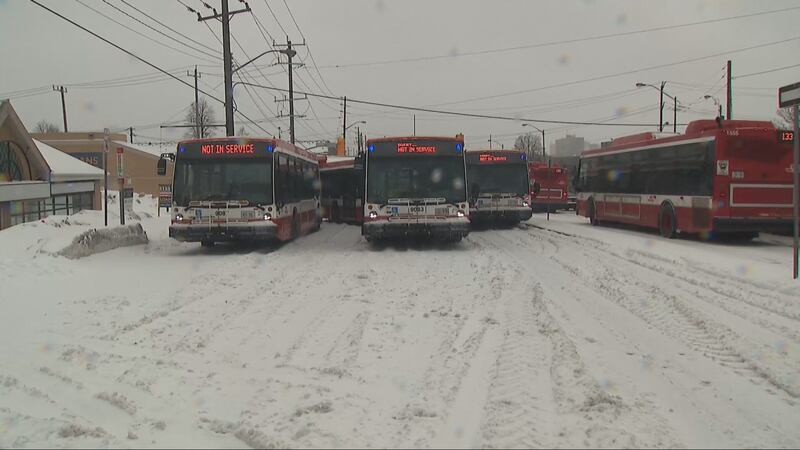 A CTV camera captured several TTC buses stuck in the snow in the area of Midland Avenue and Eglinton Avenue East.
