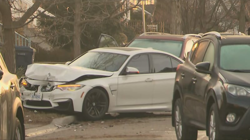 Police confirmed a white BMW that crashed into other parked cars in the area is believed to be connected to the homicide.