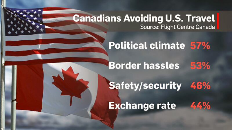 A survey by Flight Centre found that Canadians are still avoiding travelling to the United States, with 57 per cent concerned about the political climate, 53 per cent worried about border hassles, 46 percent having safety and security issues and 44 percent saying they have concerns about the exchange rate.