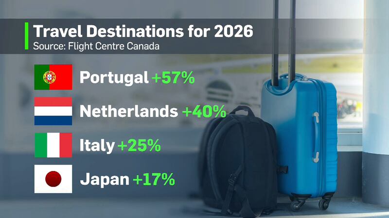 Of the summer destinations Canadians have already booked, Portugal has seen a 57 per cent increase this year, according to Flight Centre Canada. The Netherlands is up 40 percent, Italy 25 per cent and Japan has seen an increase of 17 per cent.