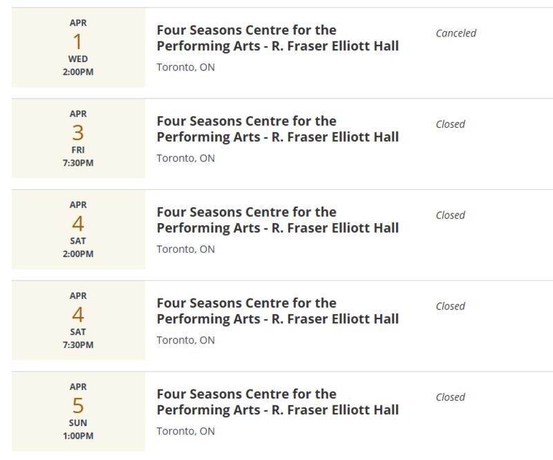 Upcoming shows at the Four Seasons Centre were set to take place on April 1 at 2 p.m., April 3 at 7:30 p.m., April 4 at 2 and 7:30 p.m., and April 5 at 1 p.m.