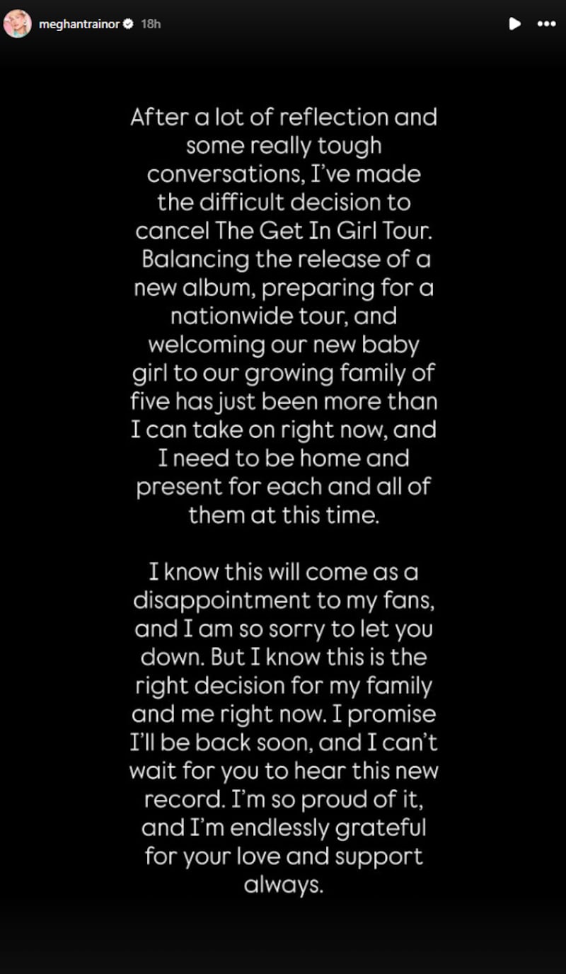 In a post to her Instagram stories, the “All About That Bass” singer said she had some “tough” conversations before arriving at the decision to scrap the tour outright.