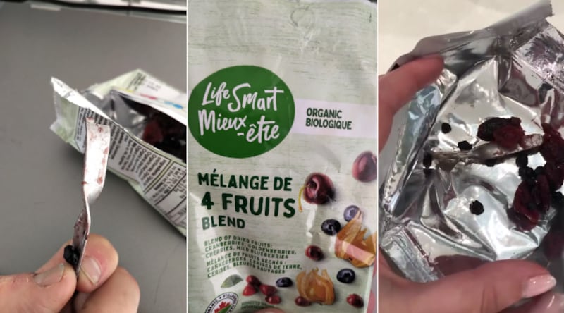 An Ontario mother is speaking out after she says that she found a “jagged” metal blade inside a bag of dried fruit she purchased for her two-year-old daughter from a grocery store.