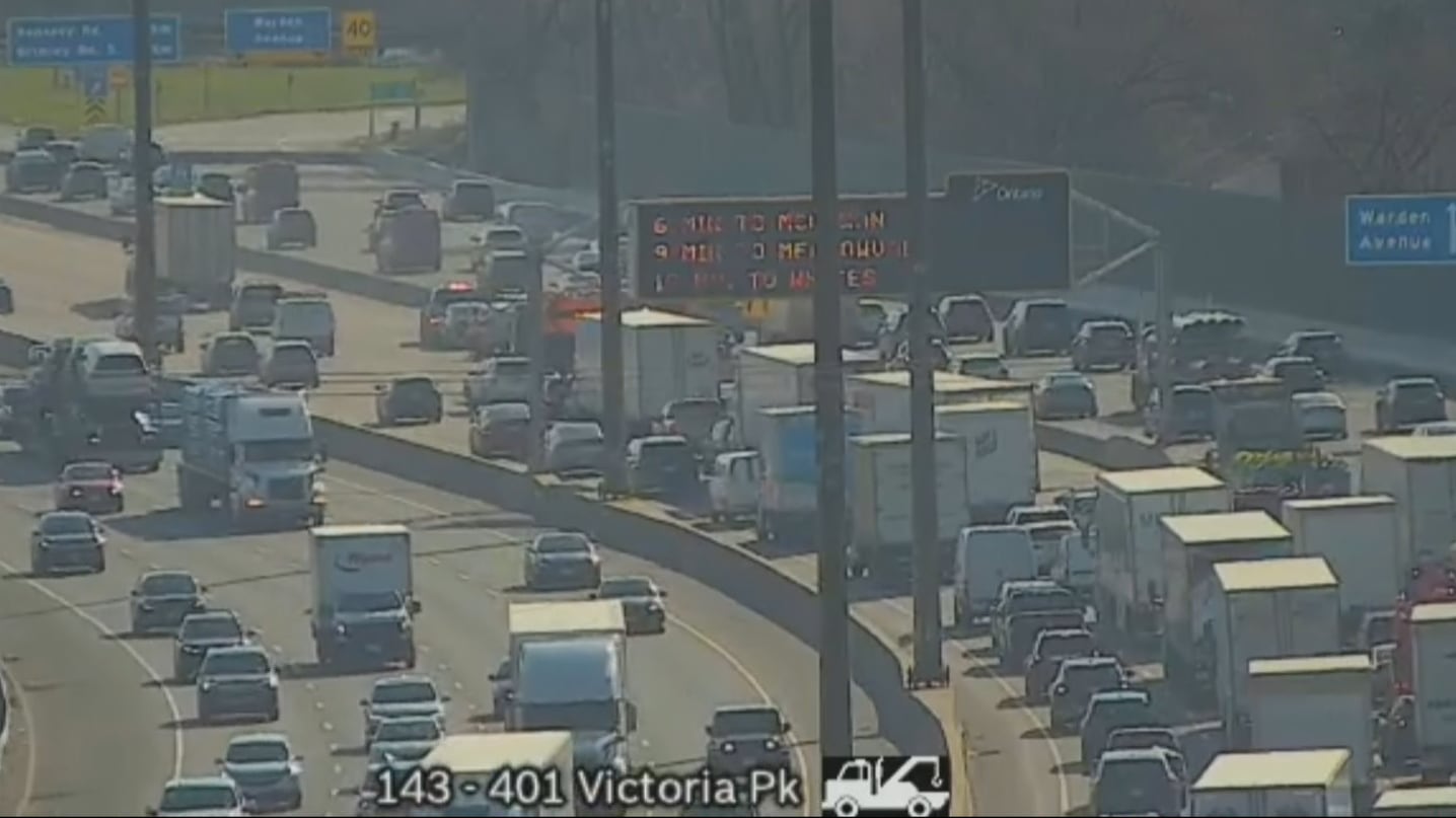Two right express lanes are blocked on the eastbound 401 at Victoria Park, bringing traffic to a grinding halt in the area.