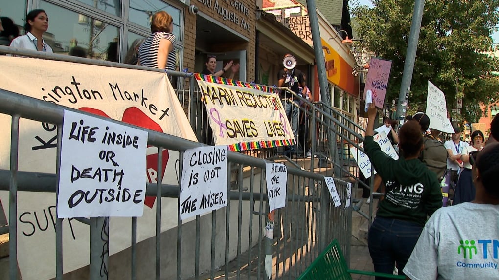 At least 100 people gathered outside the Kensington Market supervised consumption site in a rally to keep it open in the face of new provincial rules that would shut at least a dozen such sites down across Ontario.