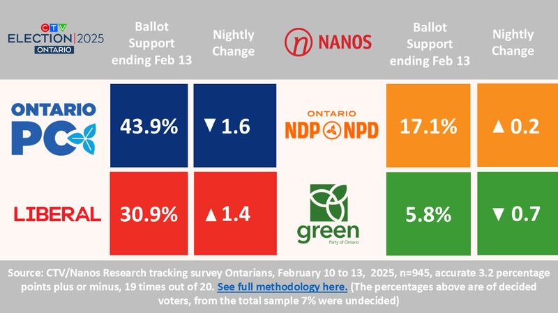 Nanos Research conducts random interviews with a three-night rolling average of about 900 Ontario voters. Survey results released Friday included 920 Ontario voters who were interviewed between Feb. 8 and Feb. 10. The survey has a margin of error of 3.2 per cent, 19 times out of 20.