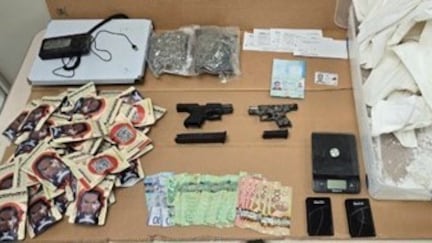 Officers seized a quantity of drugs, drug packaging and proceeds of crime during the search. Police said a woman was also found in possession of two loaded firearms.