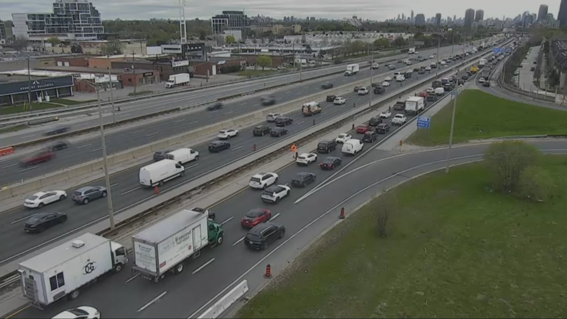 The city says the eastbound Gardiner will be reduced to a minimum of two lanes during the day and one lane overnight between Islington Avenue and Park Lawn Road to accommodate “emergency pavement repairs to the shoulder.”