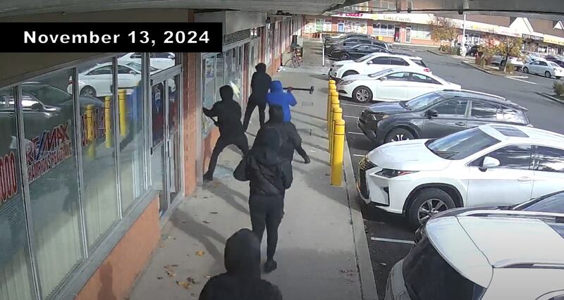 Project Night Train Several robbery suspects are seen in a surveillance video breaking into what appears to be a store at a commercial plaza. (Peel Regional Police)