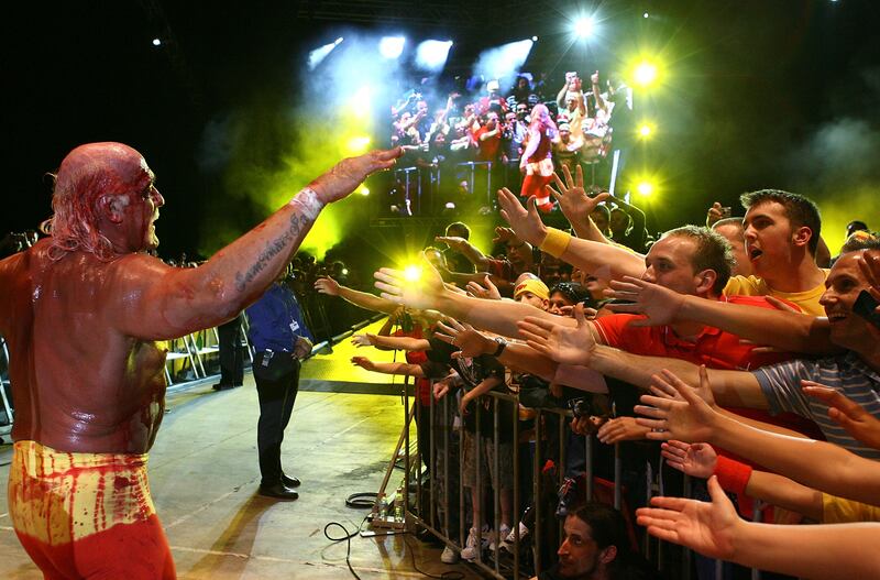 Hulk Hogan makes his entrance during a match while working for the WWE. (Photo by WWE/WWE via Getty Images)