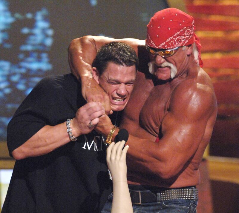 John Cena and Hulk Hogan during 2005 Teen Choice Awards - Show at Gibson Amphitheater in Universal City, California, United States. (Photo by Jeff Kravitz/FilmMagic, Inc)