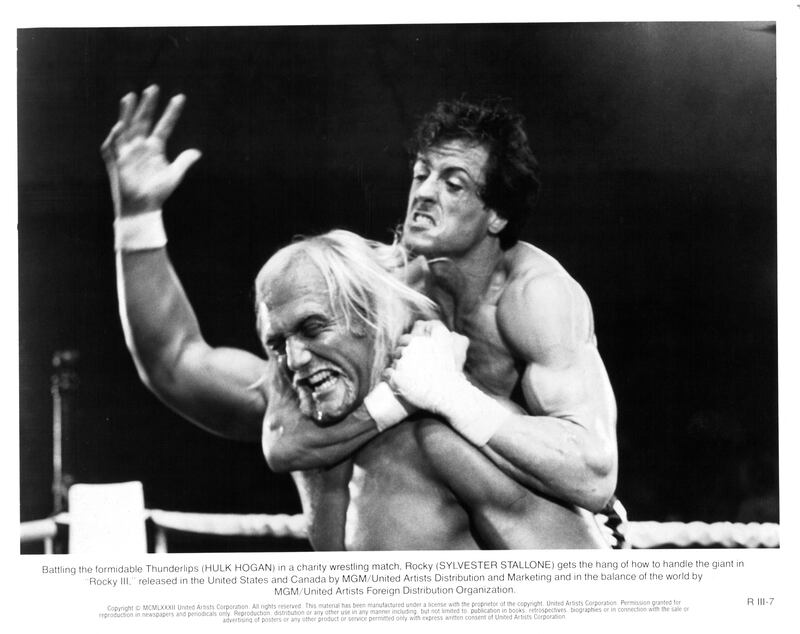 Actor Sylvester Stallone and actor Hulk Hogan on set of the MGM/United Artist movie "Rocky III" in 1982. (Photo by Michael Ochs Archives/Getty Images)