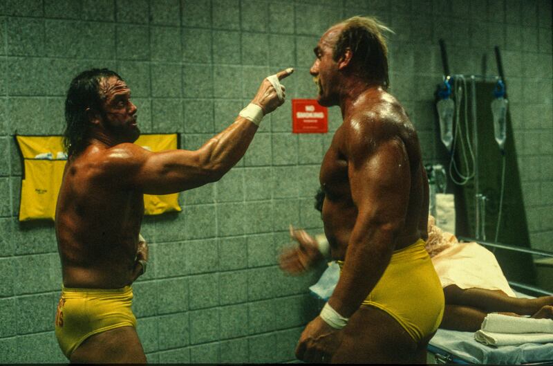 Macho Man Randy Savage faces off with Hulk Hogan backstage during Saturday Night's Main Event on February 3, 1989 at the Bradley Center in Milwaukee, Wisconsin. (Photo by WWE/WWE via Getty Images)