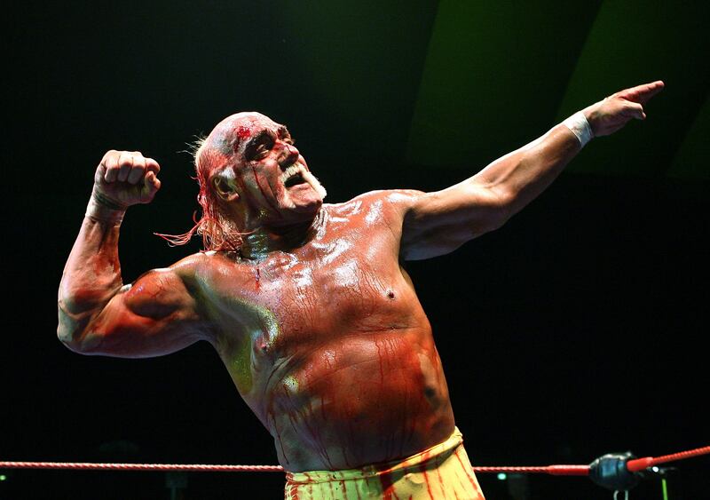 Hulk Hogan gestures to the audience during his Hulkamania Tour at the Burswood Dome on November 24, 2009 in Perth, Australia. (Photo by Paul Kane/Getty Images)