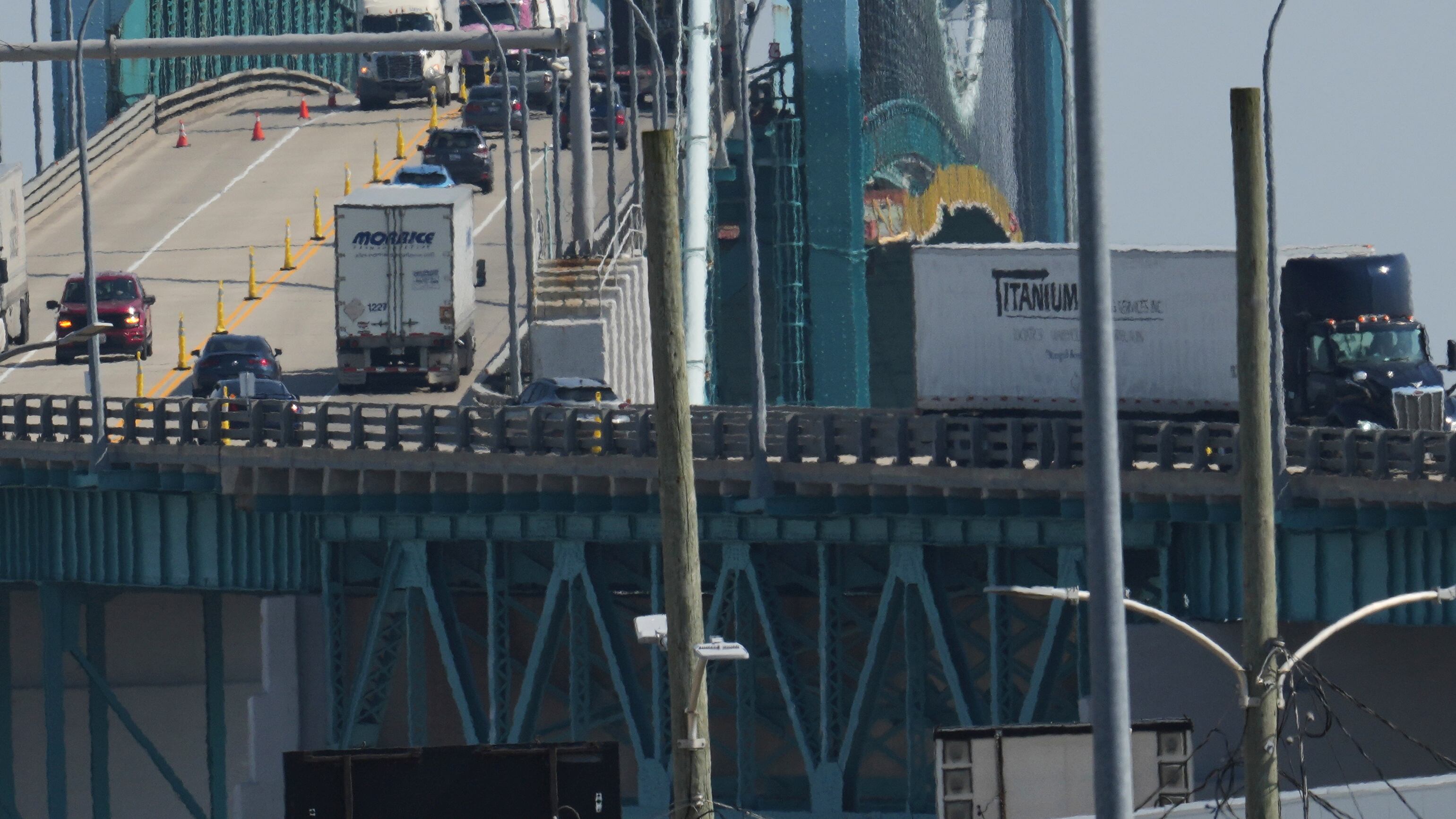 Trucks cross the Ambassador Bridge between Windsor, Ontario and Detroit, Thursday, Aug. 7, 2025. (AP Photo/Paul Sancya)
