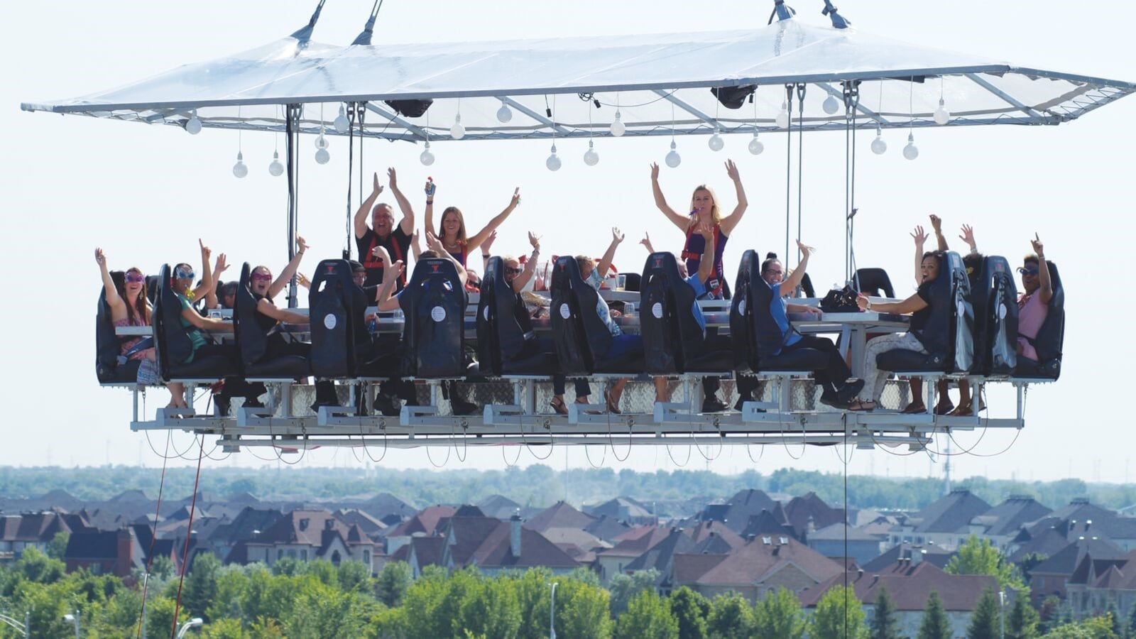 The dinner table, suspended by a crane, can hold as many as 22 strapped-in guests at one time, all of whom will be treated to 360-degree-views of the CNE midway while being treated to dishes from a “Chef’s Table.”