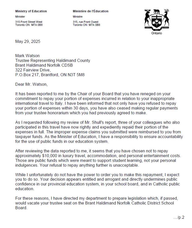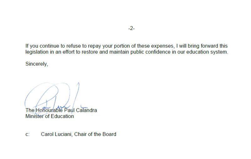 “The improper expense claims you submitted were reimbursed to you from taxpayer funds. As the Minister of Education, I have a responsibility to ensure accountability for the use of public funds in our education system,” the letter continued.
