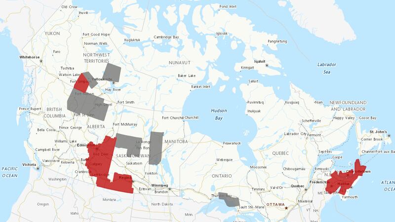 Affected areas include northeastern British Columbia, northwestern Albera, central Saskatchewan, western Manitoba and areas of the Northwest Territories like Fort Liard, Fort Simpson and the North Slave Region.